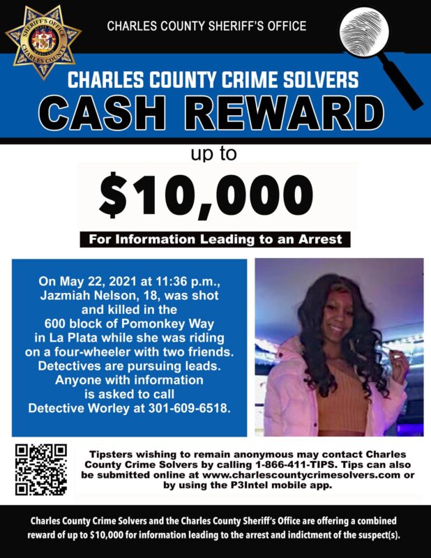 FACTS of CASE: On May 22, 2021, at approximately 11:36 p.m., 18-year-old Jazmiah Zyri Nelson, was fatally shot while riding a four-wheeler with two acquaintances near the 600 block of Pomonkey Way in La Plata, MD.