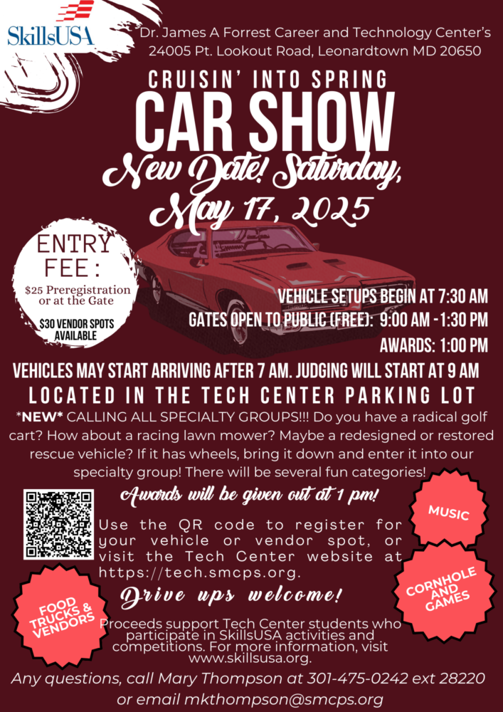 The Dr. James A. Forrest Career & Technology Center’s Annual SkillsUSA Cruisin’ Into Spring Car Show has been rescheduled to Saturday, May 17, 2025. The event runs from 9:00 a.m. to 1:30 p.m. in the school’s parking lot.