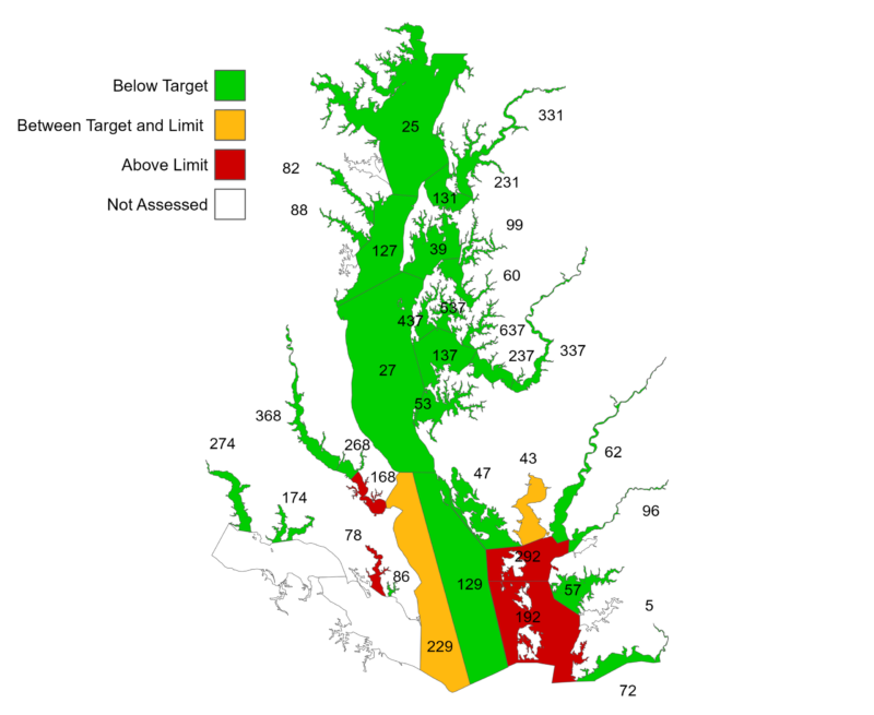 The stock assessment assessed fishing pressure on oysters across the Bay, finding 29 out of 35 areas (in green) with low fishing pressure, two areas between target and limit (in yellow), and four areas above the limit (in red). DNR