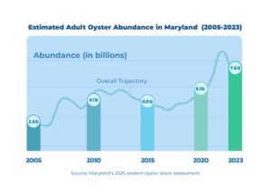The 2025 stock assessment estimated Maryland’s overall oyster population over time, showing a progressive increase from 2005 to 2024. DNR/James Point Du Jour