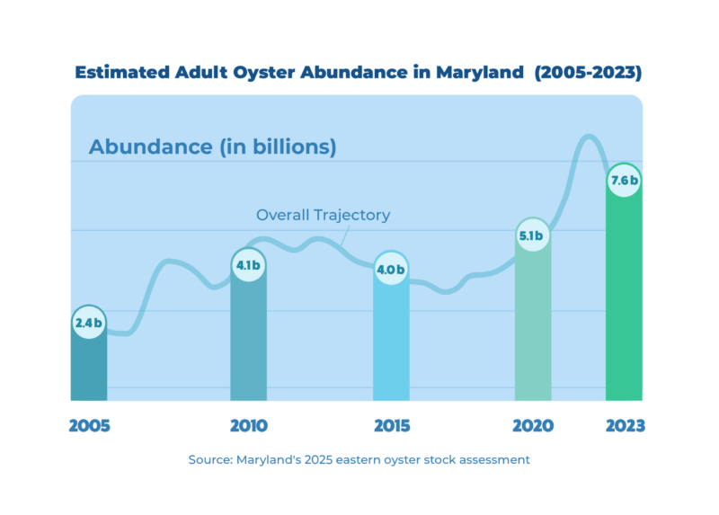 The stock assessment estimated that more than 12 billion oysters live in Maryland’s waters of the Chesapeake Bay in 2024, including about 7.6 billion adult oysters and over 5 billion spat, or juvenile oysters. The assessment estimates there were only 2.4 billion adult oysters in 2005.