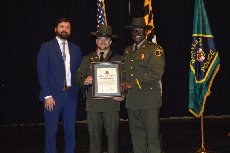 Cpl. William Ruffner receives the 2024 NRP Officer of the Year Award, joined by Secretary Joshua Kurtz and Colonel Orlando D. Lilly. Ruffner was also presented an Award of Merit. Maryland DNR photo.