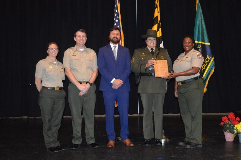 Sgt. Danielle Brown is honored with the Maryland Park Service NRP Officer of the Year Award, presented by Park Service Deputy Director Rachel Temby, Ranger William Sade, Sec. Kurtz, and Park Service Director Angela Crenshaw.
