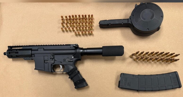 A subsequent search of the dumpster revealed a loaded, unserialized AR-15-style pistol with a full magazine and a round chambered. Detectives also recovered a discarded backpack nearby containing a loaded 50-round drum magazine for a 9mm handgun.