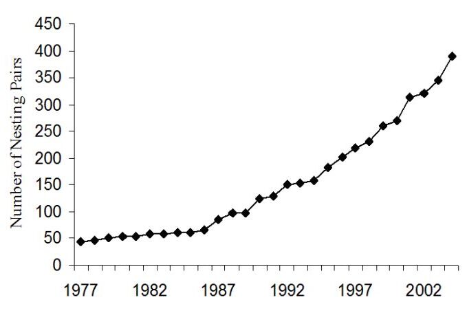 For a while, a few more active nests would appear each year, but by 1990 they found 123 breeding pairs, and 200 only six years later.