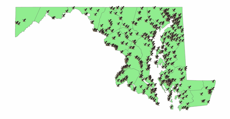 Bald eagles are now widely distributed across Maryland, with nest locations mapped by volunteers. Via the Maryland Bird Conservation Partnership