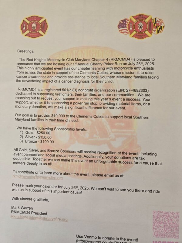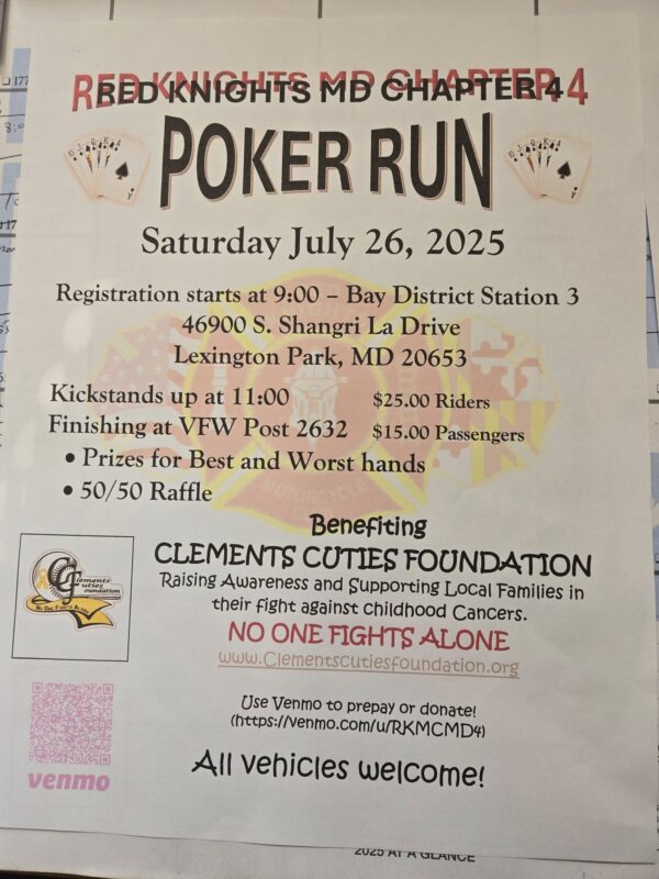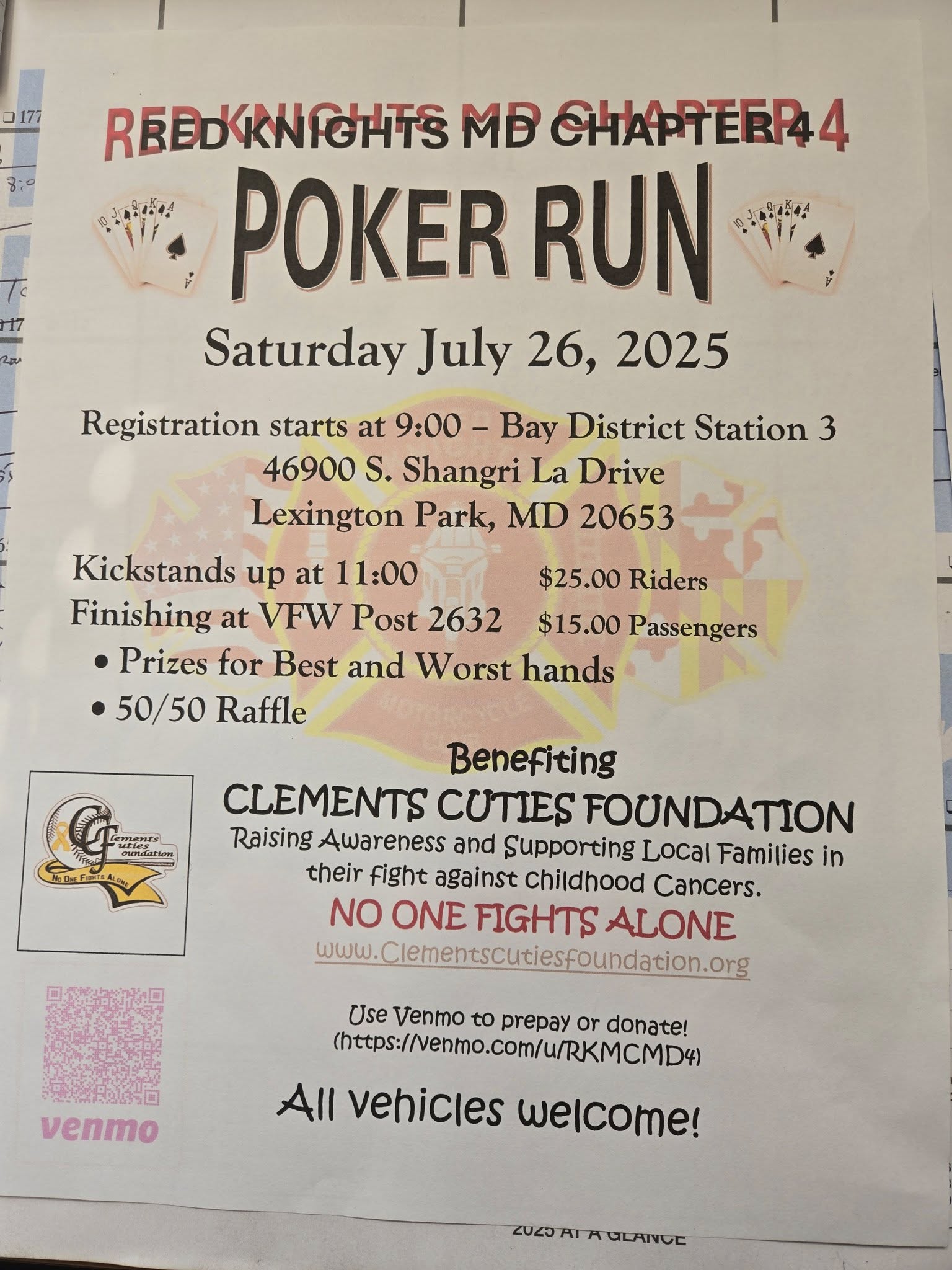 The Red Knights MD Chapter 4 is excited to announce their 1st Annual Charity Poker Run held on Saturday, July 26, 2025, to benefit an amazing foundation.
