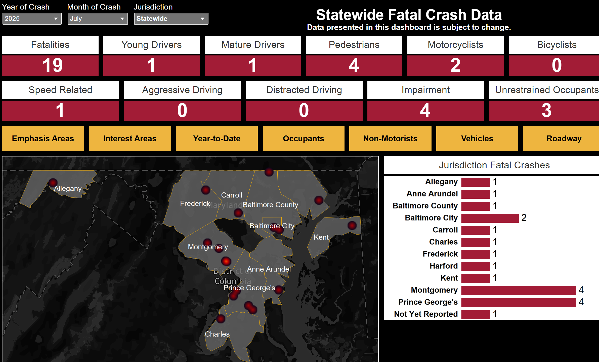 Maryland Crash Data for the entire state shows there were 19 fatal crashes, with four involving impairment.