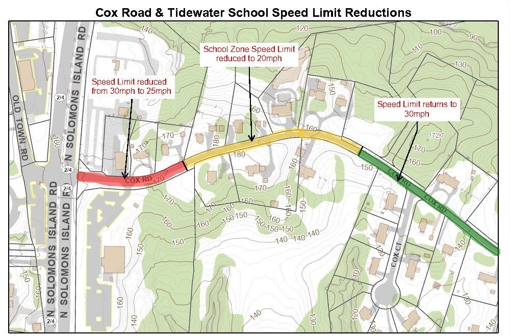 The Calvert County Department of Public Works advises motorists of an upcoming speed limit change on Cox Road near Tidewater School in Huntingtown.