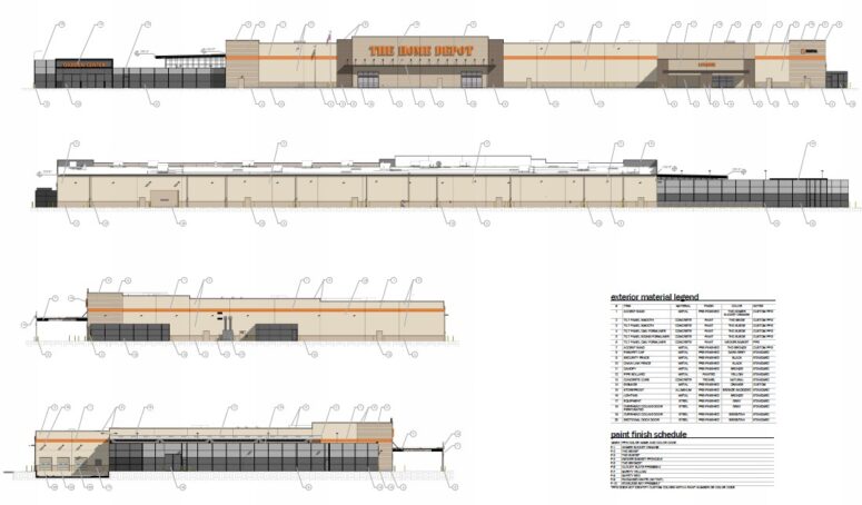 Architecturally, the store will look familiar to shoppers, but with some adjustments to meet local design objectives. The building will use muted beige and bronze tones with the iconic “Homer Bucket Orange” reserved for signage accents. Rooftop equipment will be screened from view, and canopies will define the main and garden entrances. The plan aims to break up long wall sections and include pedestrian-friendly features like sidewalks and marked crosswalks.