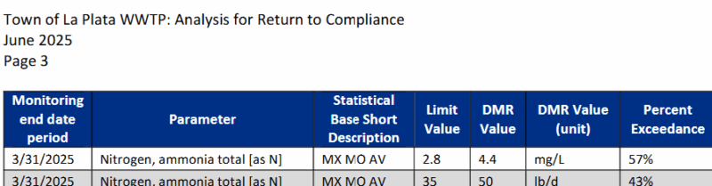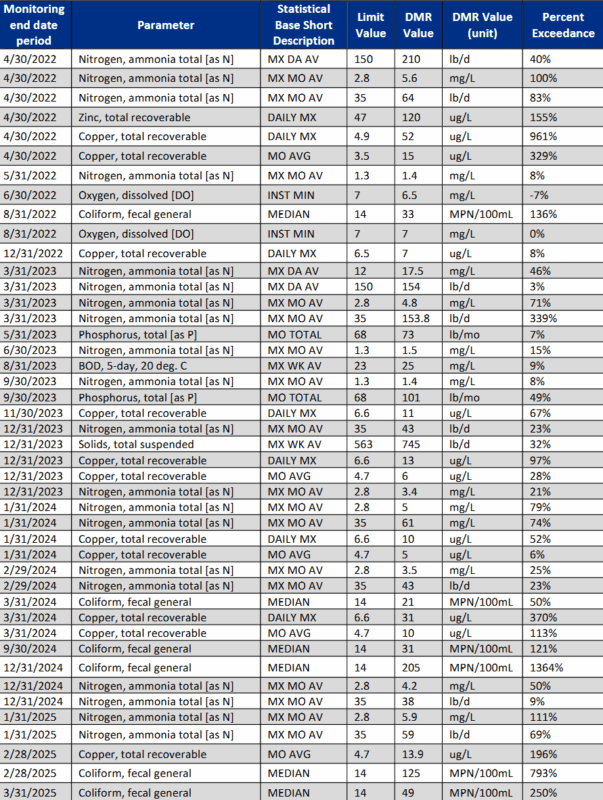 MDE’s compliance assessment found these incidents, combined with 65 documented permit violations from July 2019 through July 2024, raised serious concerns. Violations ranged from exceedances of total nitrogen, ammonia-nitrogen, and suspended solids to coliform bacteria issues tied to disinfection system failures.