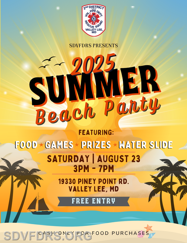 Join the Second District Volunteer Fire Department & Rescue Squad for our Third Annual Beach Party! We’re bringing the community together for an afternoon of fun, food, games, and summer celebration — perfect for the whole family.