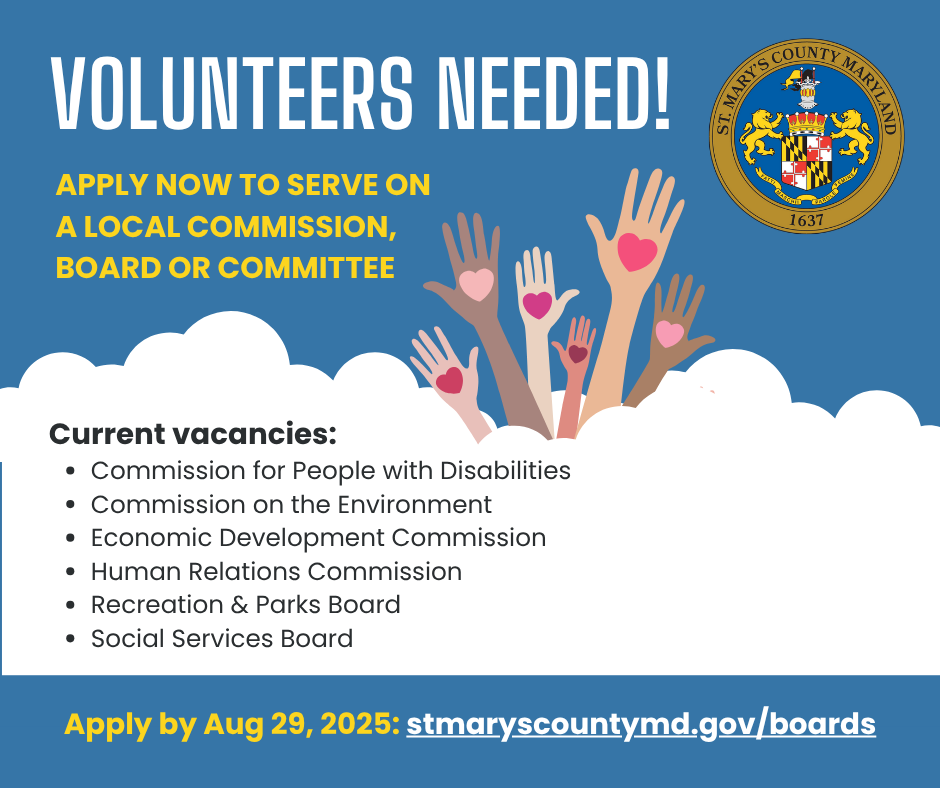 Visit www.stmaryscountymd.gov/boards for board descriptions and to complete the online application. All applications must include a resume and be submitted by August 29, 2025.