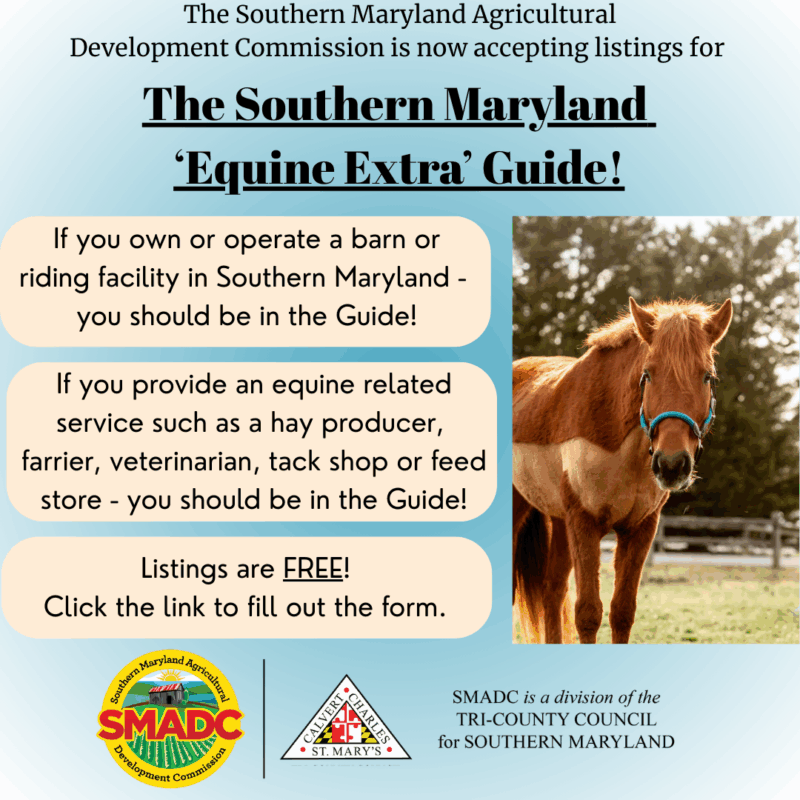 The Southern Maryland Agricultural Development Commission (SMADC), a division of the Tri-County Council for Southern Maryland, announces applications are being accepted for the 2025 Southern Maryland Equine Directory. There is no fee to be listed. Submission deadline is November 3, 2025.