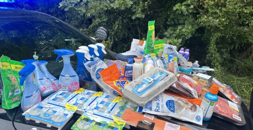 On August 20, at approximately 10:59 a.m., patrol officers responded to a grocery store located on King Street in Waldorf for the report of a theft in progress. Store security reported that two suspects had stolen a shopping cart filled with laundry detergent, cleaning supplies, personal care products, steaks, and other items valued at $1,200.