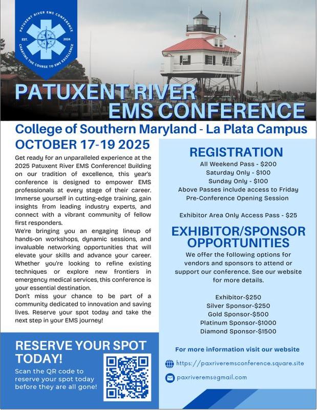 The 2025 Patuxent River EMS Conference is set to take place October 17–19 at the College of Southern Maryland’s La Plata Campus, offering an unparalleled experience for emergency medical professionals and industry partners.