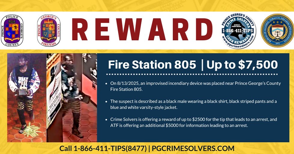 The Prince George’s County Police Department, in conjunction with the Office of the Fire Marshal for Prince George’s County and the Bureau of Alcohol, Tobacco, Firearms, and Explosives, is investigating an improvised incendiary device that was placed near Fire Station 805 in Capitol Heights on August 13, 2025, at approximately 8:00 a.m.