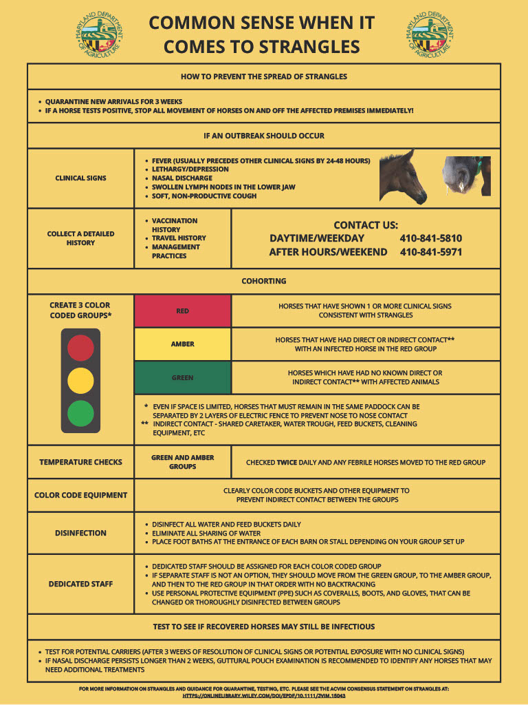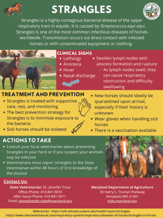 Strangles Outbreak Alert: The Maryland horse community is currently experiencing a significant outbreak of Strangles, a highly contagious upper respiratory disease of horses. Multiple facilities across the state have confirmed positive cases.