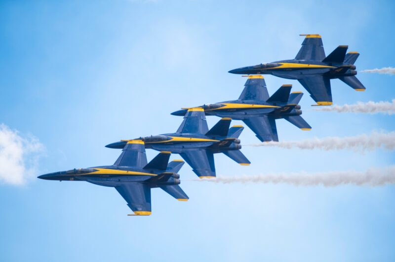 Founded in 1946, the Blue Angels fly advanced F/A-18 Super Hornets at supersonic speeds, performing complex combat maneuvers in tight formations just feet apart. The Blue Angels serve as ambassadors for the Navy and Marine Corps, inspiring patriotism and educating the public on careers in naval aviation.