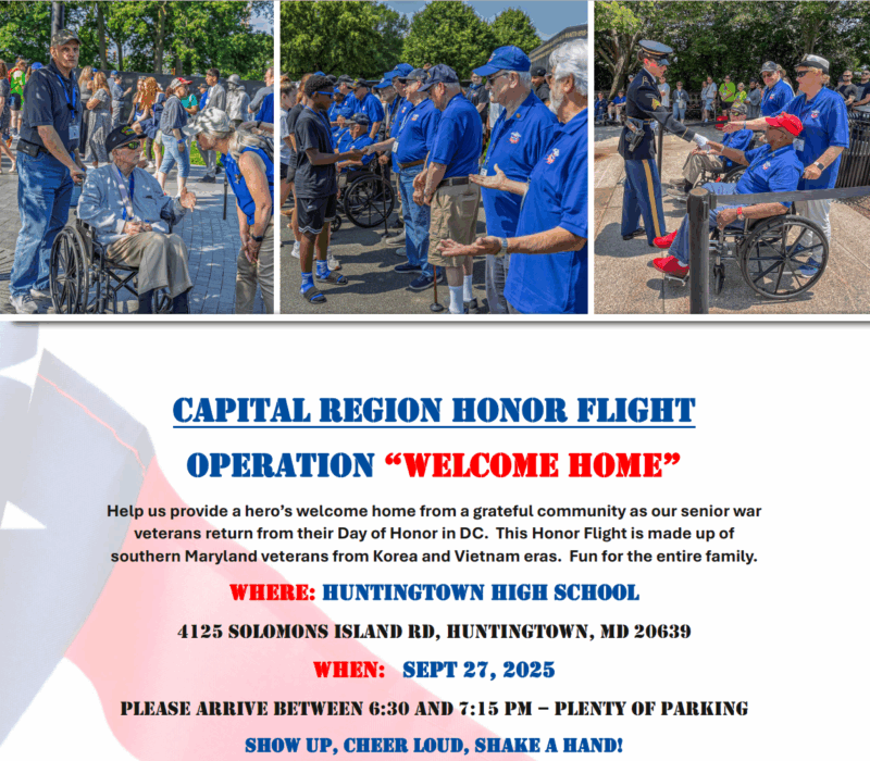 The Capital Region Honor Flight is inviting the community to welcome home and thank the return 24 Veterans on Saturday, September 27, 2025, at the Huntingtown High School.