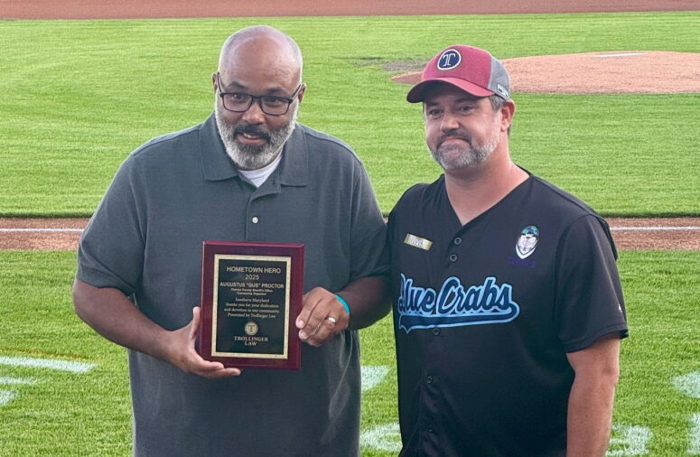 The Charles County Sheriff’s Office is celebrating one of its own as retired Sgt. Gus Proctor was recently recognized during Trollinger Law’s Hometown Hero event, held at First Responders Night with the Southern Maryland Blue Crabs.