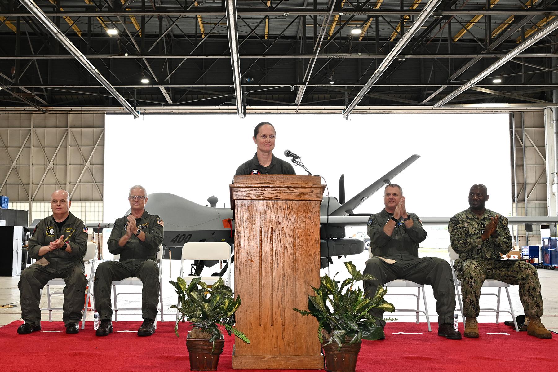 The Multi-Mission Tactical Unmanned Aerial Systems (UAS) program office (PMA-266) welcomed a new program manager during change of command and retirement ceremony Sept. 18 inside Air Test and Evaluation Squadron (UX) 24’s hangar, with the Marine Corps’ MQ-9 Reaper in the backdrop.