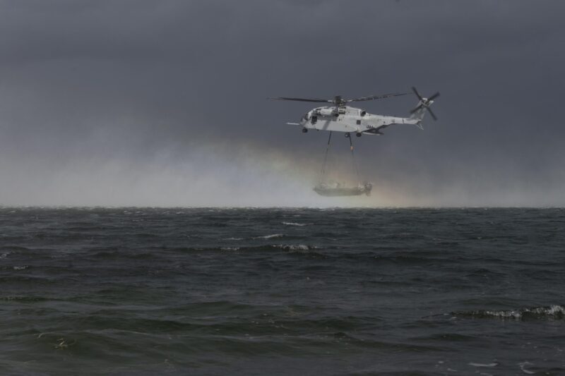 A CH-53K King Stallion with Marine Heavy Helicopter Squadron (HMH) 461, Marine Aircraft Group 29, 2nd Marine Aircraft Wing (MAW), carries a rigid-hull inflatable boat with Charlie Company, 2nd Battalion, U.S. Army Special Warfare Training Group (Airborne) at U.S. Coast Guard base Sector Key West, Florida, July 28, 2025. (U.S. Marine Corps photo by Cpl. Mya Seymour
