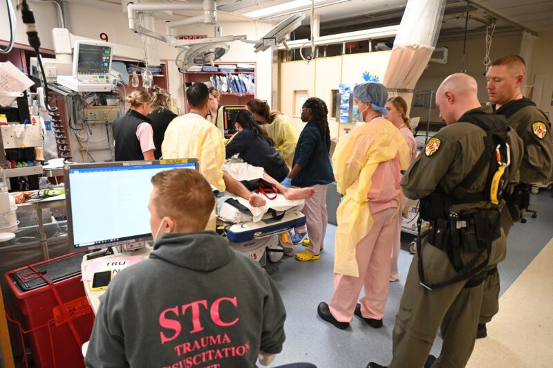 Inside Shock Trauma’s Trauma Resuscitation Unit, staff managed the arrivals under real-time conditions, reinforcing the hospital’s capacity to handle mass casualty surges.