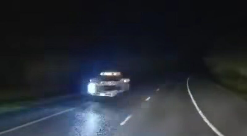 Video from a citizen that passed the truck on Budds Creek Road, captured the white pickup truck travelling with the driver side headlight broken. The vehicle has front end damage with auxiliary lights on the roof.