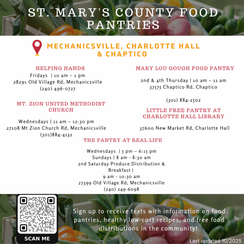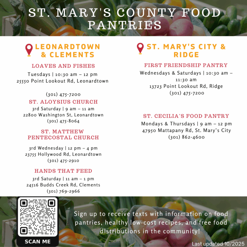 - Local Food Pantries – Please see this flyer of local food pantries in St. Mary’s County, organized by town.