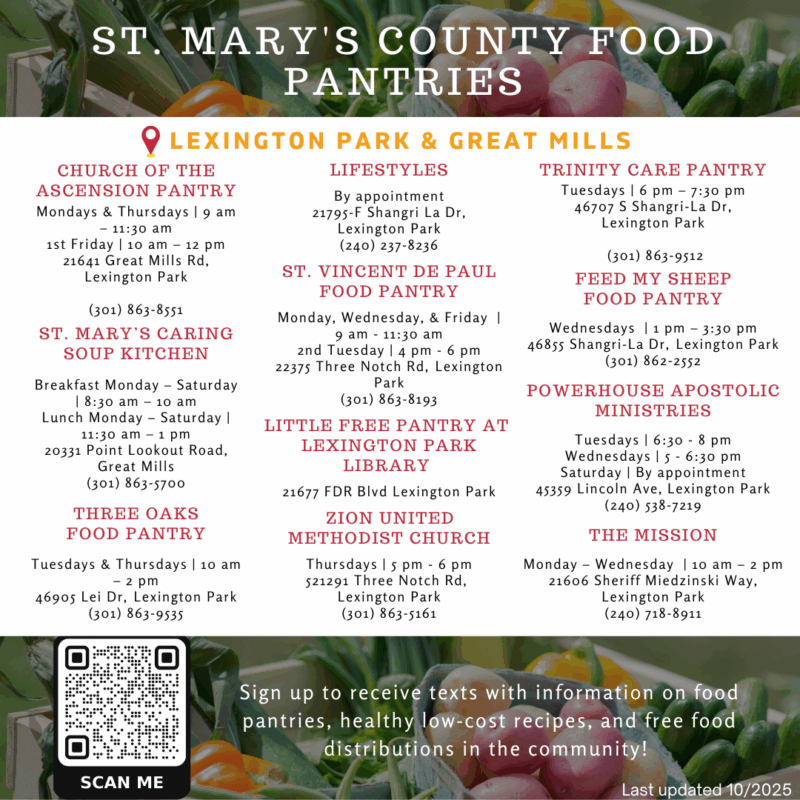 - Local Food Pantries – Please see this flyer of local food pantries in St. Mary’s County, organized by town.