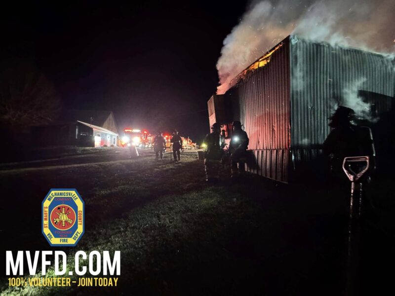 On Tuesday, December 9, 2025, at 3:43 a.m., firefighters from Mechanicsville, Hollywood, Leonardtown, Hughesville, Bay District, and Seventh District responded to the 38000 block of Copsey Farm Lane in Mechanicsville, for the reported building on fire.
