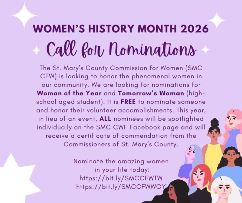 Do you have an exemplary woman or young woman in your life? In honor of Women’s History Month, the St. Mary’s County Commission for Women (SMC CFW), in an effort to recognize as many phenomenal women in the community as possible, will virtually recognize all nominees for Tomorrow’s Woman and Woman of the Year throughout the month of March on their Facebook page.