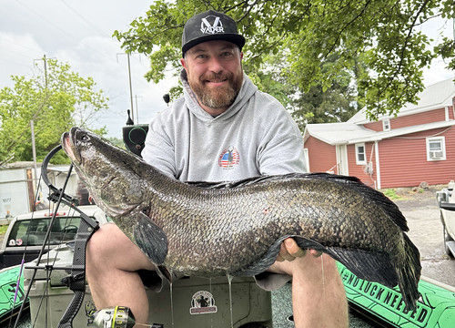 Matt Foreman of Crownsville holds the state record Chesapeake Channa, a 21.8-pound fish caught June 7, 2025. Foreman used a Vadersbow Saber X bow with a generic tip to catch his record fish. Photo courtesy Matt Foreman