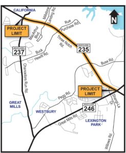 The project, identified as SM124B21, focuses on the stretch of MD 235 between MD 237 (Chancellors Run Road) and MD 246 (Great Mills Road) in St. Mary’s County. The corridor has been identified by SHA for improvements under the Maryland Pedestrian Safety Action Plan (PSAP), which targets areas with higher risks for pedestrian and bicycle crashes.